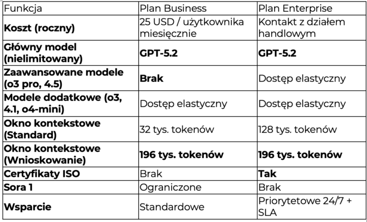 Plan Enterprise zawiera wszystko, co oferuje Business, a dodatkowo zapewnia funkcje klasy korporacyjnej. Te funkcje to między innymi większe okno kontekstu (obsługa dłuższych danych i większych plików), zaawansowane bezpieczeństwo i kontrolę (m.in. SCIM, EKM, RBAC, weryfikacja domen, analityka użytkowników) oraz rozszerzoną ochronę prywatności i rezydencję danych w 10 regionach. Otrzymujesz też priorytetowe wsparcie 24/7, SLA i możliwość ustaleń prawnych pod potrzeby organizacji.